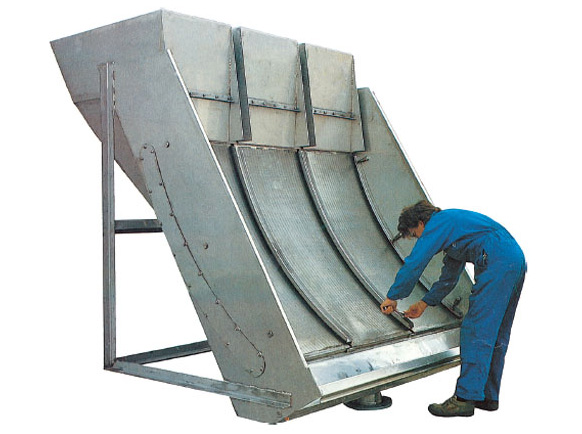 獨特的篩板是由楔形棍條形成的弧形表面構成,棍條之間有水平的縫隙,通常縫寬350 微米。要被篩選的液流通過進漿箱進入,靠重力通過一個堰嘴流向篩板,當懸浮液沿著篩板流動時,薄層水被篩板棍條切離,并隨著細小顆粒一起通過篩縫。